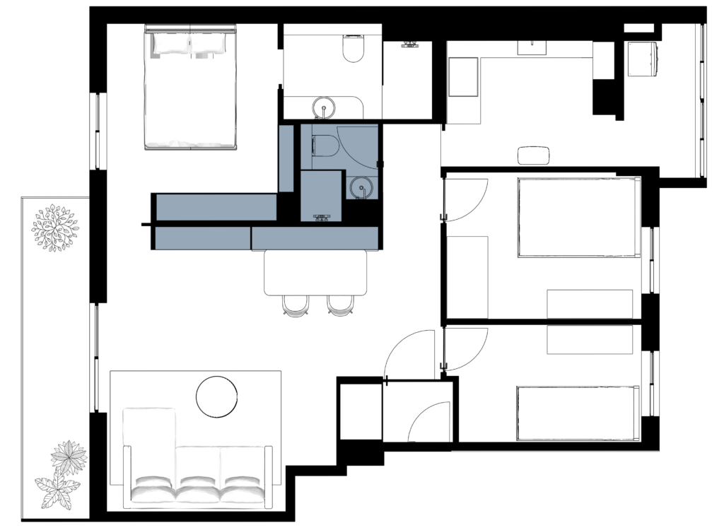Voor dit appartement is een geheel nieuwe indeling bedacht en een ontwerp gemaakt voor maatwerk kasten. De bewoners van dit appartement hebben de wens om diverse functies kwijt te kunnen, geen open floorplan maar ook niet hokkerig. Zo zijn er drie slaapkamers en twee badkamers bedacht door de de ruimte op een slimme manier in te delen. Opbergruimte is key in kleinere woningen en zorgt voor rust. In het midden van de woning is een volume bedacht waar de 2e badkamer in zit en die ook dient als scheiding is tussen de woonkamer en master bedroom. Op diverse plekken zijn schuifdeuren toegepast, die geven de ruimte een speels karakter en nemen veel minder ruimte in beslag.